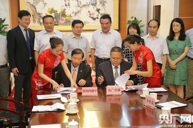 國高網路宇信息技術有限公司董事長鄭海軍與央廣傳媒發展總公司董事長、總經理王躍進分別在協議書上簽字