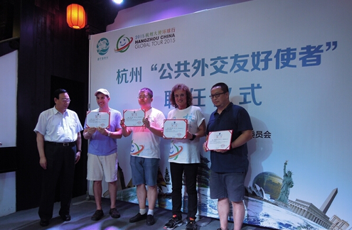 今年7月,中國的英文出租車司機周震家庭,美國加州音樂人卡帕爾迪家庭及中美各一名媒體達人,被杭州市正式聘任為“杭州公共外交友好使者”,共同橫跨亞歐、美洲大陸,途徑7個國家、8座城市,環球旅行30天。美籍“大使”多梅尼科·卡帕爾迪說,在杭州,沒有外國人,只有家人和朋友。