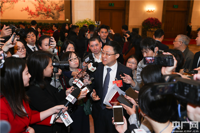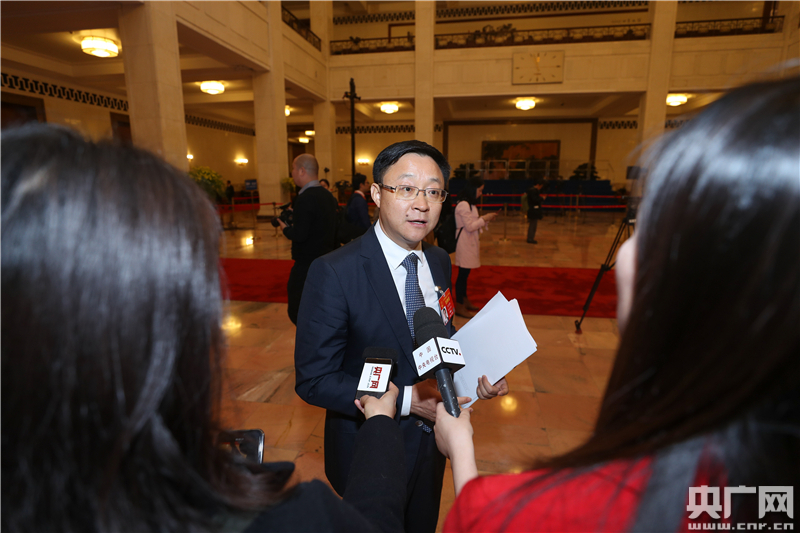全國(guó)人大代表劉慶峰在十三屆全國(guó)人大二次會(huì)議開(kāi)幕會(huì)后接受記者采訪。(央廣網(wǎng)記者 韓靖 攝)