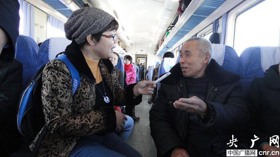 采訪中,乘客們對列車服務贊不絕口。第一次出遠門的甘肅乘客王大龍:“車上很干凈,秩序也好,上車也很方便!”來自四川的李志華老人望著車窗悠悠的說 “現在,內蒙古這邊還是冰天雪地的,可翻過秦嶺,就到了我們四川平原了,就看見綠色了,這車就像是一趟開往春天的列車!