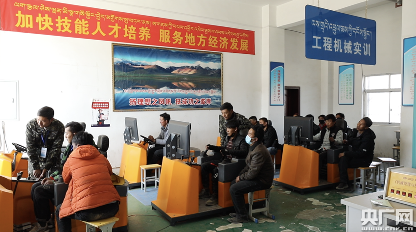 來自各地的農牧民正在學習挖機駕駛技術(央廣網記者 普布次仁 攝)