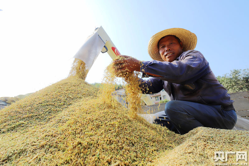 安福縣赤谷鄉陂頭村村民胡小平在收割中稻。(央廣網發 通訊員劉麗強 攝)