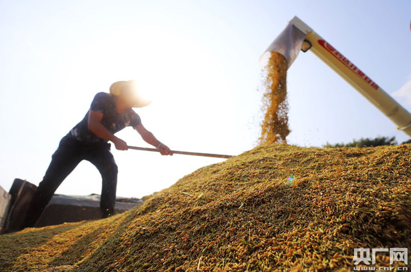 央廣網安福9月1日消息(記者王一凡 通訊員劉麗強 朱華)9月1日,在江西省吉安市安福縣赤谷鄉蒼坑村的農田里,機聲隆隆,熱浪滾滾,一輛輛收割機正在稻田中作業,隨著機器來回穿梭,一丘丘金黃的稻子變戲法似的不見蹤影。此時,村民劉克勤和妻子一起在田邊捆扎糧袋,準備搬運到公路上裝車,夫妻倆臉上全是汗水。“今年中稻畝產有1400斤,如果不是水災,產量肯定還要高點。”劉克勤說。