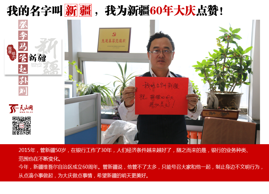 管新疆:今年是自治區成立60周年,就讓我們大家攜起手來,制止不文明行為,從點滴做起,讓新疆的明天更加美好!在自治區成立60周年之際,我祝愿咱們大美新疆更加美麗、人們的生活越來越好!