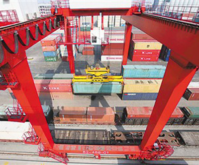 2016年2月25日,在中哈(連云港)物流基地鐵路專用線上,大型門機正在吊裝出口集裝箱。王健民攝 (人民圖片)