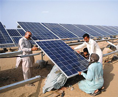 巴基斯坦工人在中興能源900兆瓦光伏地面電站安裝太陽能電池板。艾哈邁德·卡邁勒攝(新華社發)