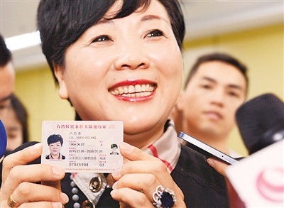 2015年7月6日,臺胞盧月香在展示福建省公安機關出入境管理部門簽發的首張電子臺胞證。 新華社記者 張國俊攝