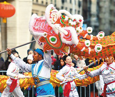 2016年2月9日,美國紐約林肯中心廣場上的舞龍表演。新華社記者 王 雷攝