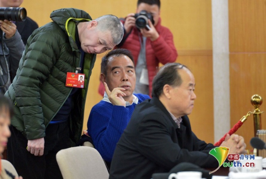 中國青年網北京3月5日電 3月5日,在全國政協十二屆四次會議小組會議上,各組的委員們正忙碌著審議常委會工作報告和提案工作情況報告。委員們時而“交頭接耳”,時而“竊竊私語”。圖為 馮小剛委員(左)與陳凱歌委員(中)交談。