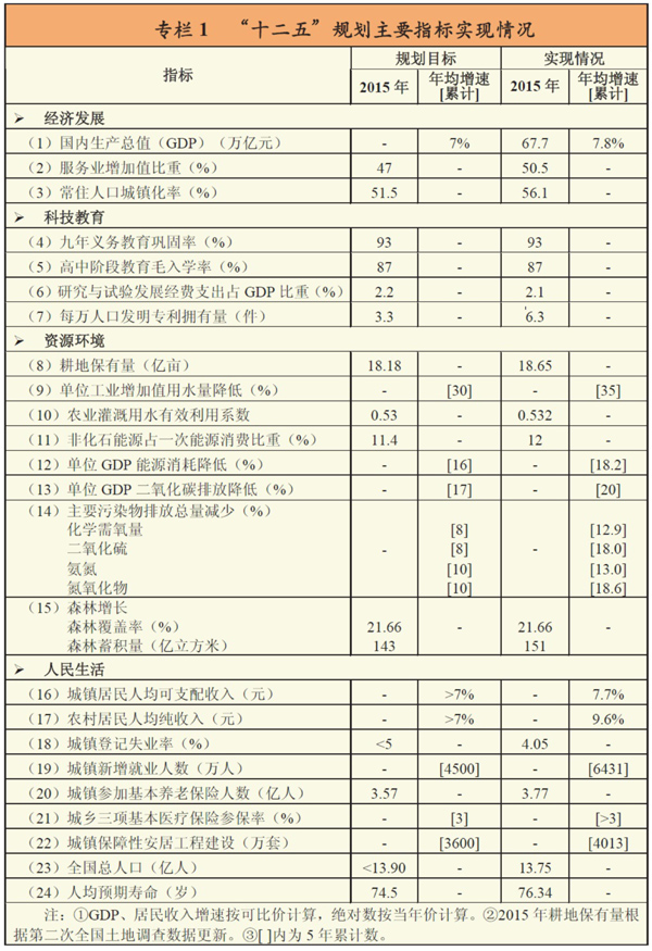 積極應對國際金融危機持續影響等一系列重大風險挑戰,適應經濟發展新常態,不斷創新和完善宏觀調控,推動形成經濟結構優化、發展動力轉換、發展方式轉變加快的良好態勢。經濟保持持續較快發展,經濟總量穩居世界第二位,人均國內生產總值增至49351元(折合7924美元)。經濟結構調整取得重大進展,農業穩定增長,第三產業增加值占國內生產總值比重超過第二產業,居民消費率不斷提高,城鄉區域差距趨于縮小,常住人口城鎮化率達到56.1%,基礎設施水平全面躍升,高技術產業、戰略性新興產業加快發展,一批重大科技成果達到世界先進水平。公共服務體系基本建立、覆蓋面持續擴大,教育水平明顯提升,全民健康狀況明顯改善,新增就業持續增加,貧困人口大幅減少,人民生活水平和質量進一步提高。生態文明建設取得新進展,主體功能區制度逐步健全,主要污染物排放持續減少,節能環保水平明顯提升。全面深化改革有力推進,經濟體制繼續完善,人民民主不斷擴大,依法治國開啟新征程。全方位外交取得重大進展,國際地位顯著提高,對外開放不斷深入,成為全球第一貨物貿易大國和主要對外投資大國,人民幣納入國際貨幣基金組織特別提款權貨幣籃子。中華民族偉大復興的中國夢和社會主義核心價值觀深入人心,國家文化軟實力不斷增強。中國特色軍事變革成就顯著,強軍興軍邁出新步伐。全面從嚴治黨開創新局面,黨風廉政建設成效顯著。我國經濟實力、科技實力、國防實力、國際影響力又上了一個大臺階。
