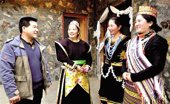扶度芳夫妻倆(左二)和門巴、珞巴族姐妹商量農(nóng)家樂的經(jīng)營事宜。麥正偉 攝