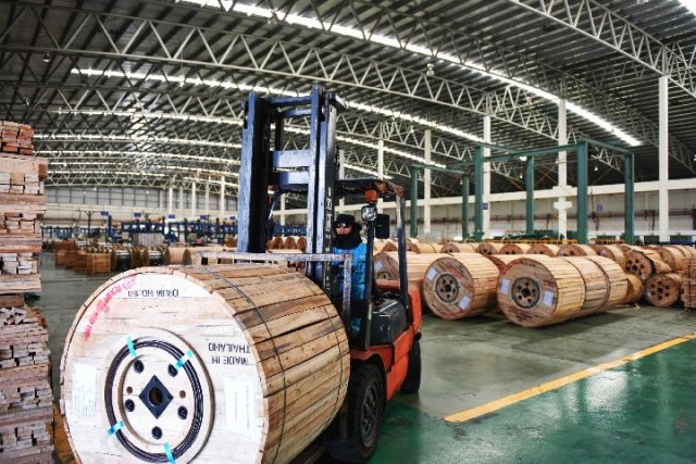 2015年5月11日,在泰中羅勇工業園,一名泰國籍工人在富通集團(泰國)通信技術有限公司駕駛叉車運輸光纜成品。(新華社記者李芒茫攝)