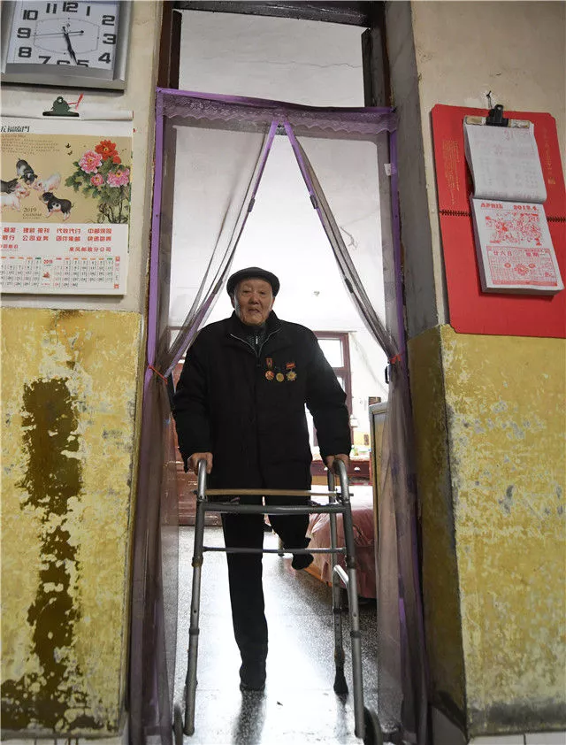左腿截肢的張富清依靠支撐架在家里活動(dòng)(3月31日攝)。新華社記者 程敏 攝