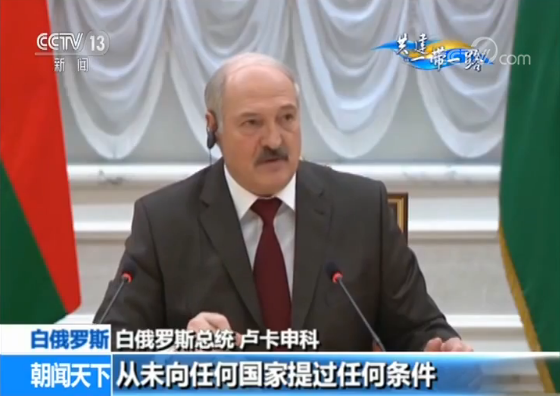 白俄羅斯總統 盧卡申科:中國在“一帶一路”合作中從未向任何國家提過任何條件,包括白俄羅斯!耙粠б宦贰辈皇侨魏涡问降馁Q易擴張,也不是中國將自身利益強加于他國的借口,在此過程中,中國是很友好地向“一帶一路”沿線國家提供貸款、投資和最先進的技術,這在世界上是絕無僅有的。
