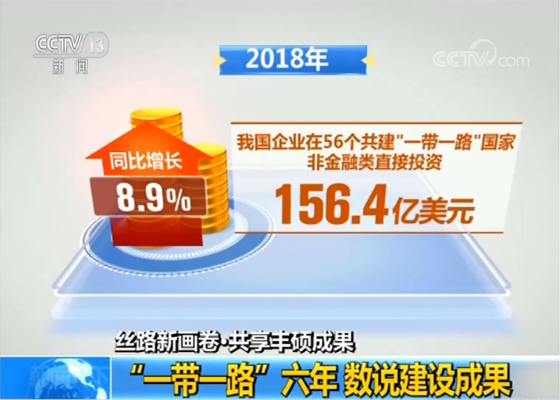 “一帶一路”貿易暢通。在全球貿易持續低迷的背景下,2013年至2017年,中國與共建“一帶一路”國家貿易總額增幅為4.88%;2018年,我國企業在56個共建“一帶一路”國家非金融類直接投資156.4億美元,同比增長8.9%。我國與共建國家已經建設80多個境外經貿合作區,為中國企業海外投資找到新空間。