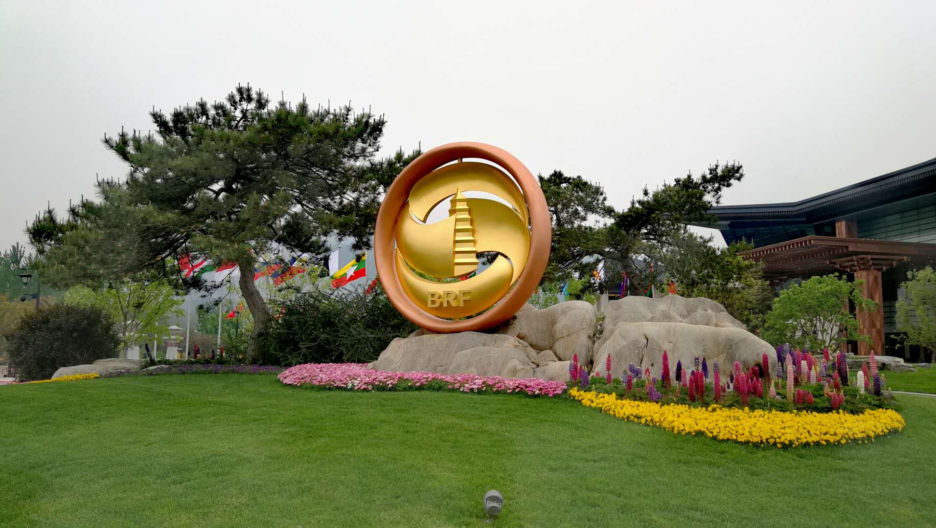 △會場外“一帶一路”國際合作高峰論壇的會標。上半部分代表“絲綢之路經濟帶”,下半部分代表“21世紀海上絲綢之路”,中間的核心元素是陜西西安的大雁塔,寓意古絲綢之路始于西安、惠及全球。(央視記者曹亞星拍攝)