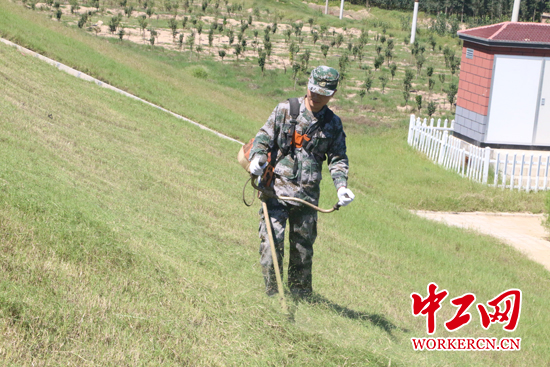 最苦最累的還要屬修剪堤防草皮。在烈日炙烤下,李濤要全副武裝背著20斤的割草機(jī),快速擺動(dòng)揮汗如雨。甩出的草屑,打在他身上跟針扎一樣疼,掃到的碎石就像小子彈,打得身上傷痕累累。被汗水浸濕的工作服,時(shí)間久了像盔甲一樣堅(jiān)硬。