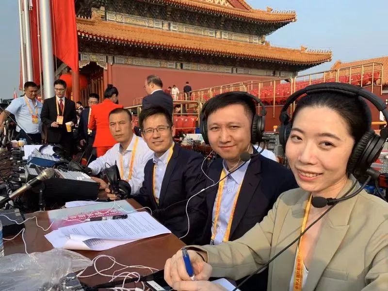 △慶祝大會、閱兵、群眾游行的國廣英語解說員趙瀛(右一)、羅來明(右二)和技術直播人員