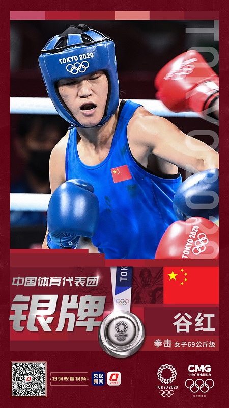 北京時間8月7日,在東京奧運會拳擊女子69公斤級決賽中,谷紅奪得銀牌。