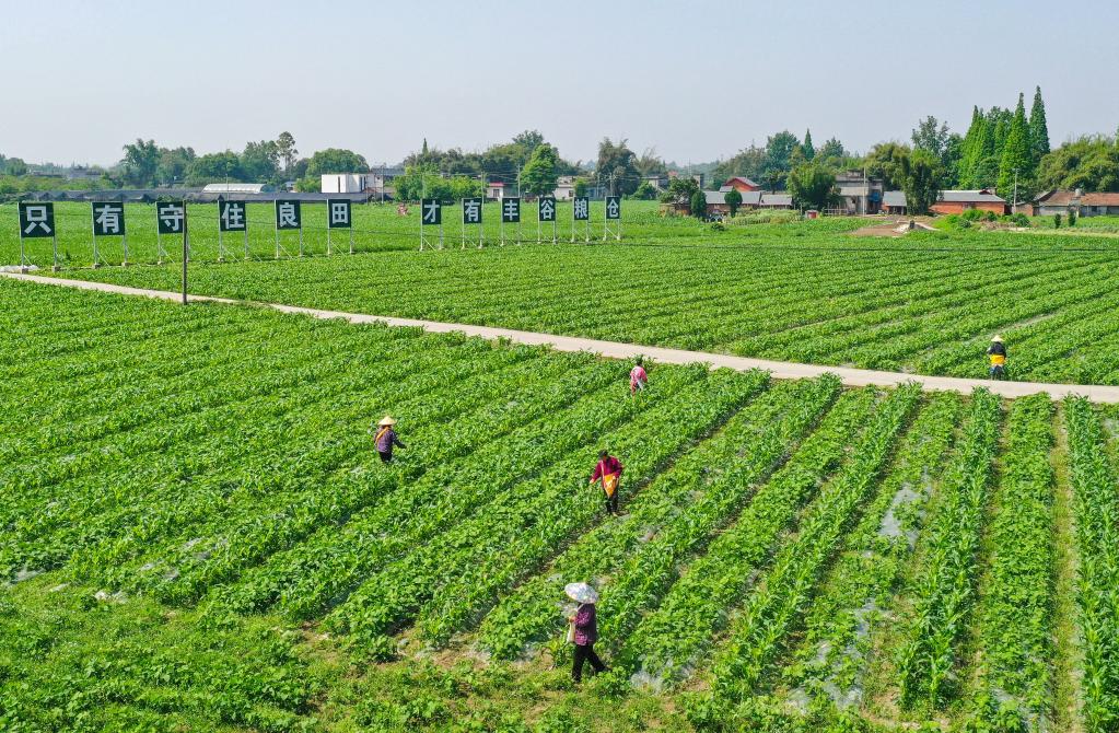 2022年4月19日,在四川省眉山市青神縣青竹街道季時壩村,村民在給種植的玉米和大豆施肥(無人機照片)。新華社記者 王曦 攝