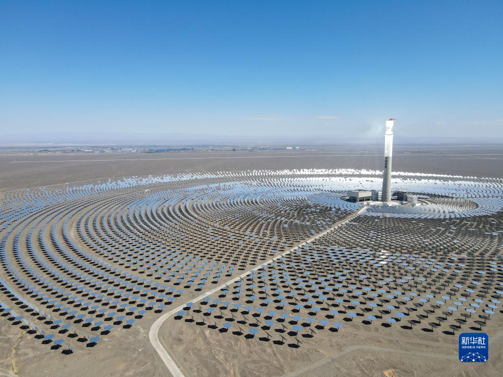 在新疆伊吾縣淖毛湖鎮拍攝的哈密50兆瓦熔鹽塔式光熱發電站(2021年8月22日攝,無人機照片)。作為新疆第一座光熱發電站,哈密50兆瓦熔鹽塔式光熱發電站不僅污染物零排放,還通過儲存熱能實現24小時持續發電。新華社記者 高晗 攝