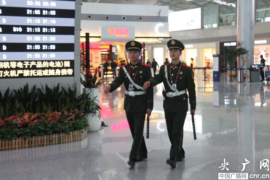 1月16日,武警官兵在貴陽龍洞堡國際機場武裝巡邏。(央廣網發 謝兆松 攝)