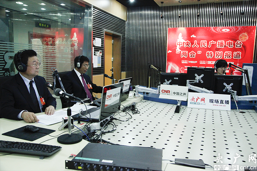 烏海市委書記侯鳳岐(右)、曲靖市市長范華平(左)做客《政務直通》(央廣網記者 趙娜娜 攝)
