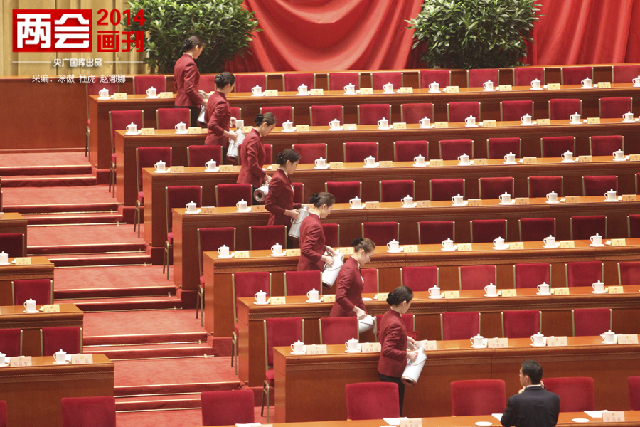 央廣網北京3月3日消息 3月3日,中國人民政治協商會議第十二屆全國委員會第二次會議在北京人民大會堂開幕。圖為工作人員做會前準備(央廣網記者 杜虎 攝)