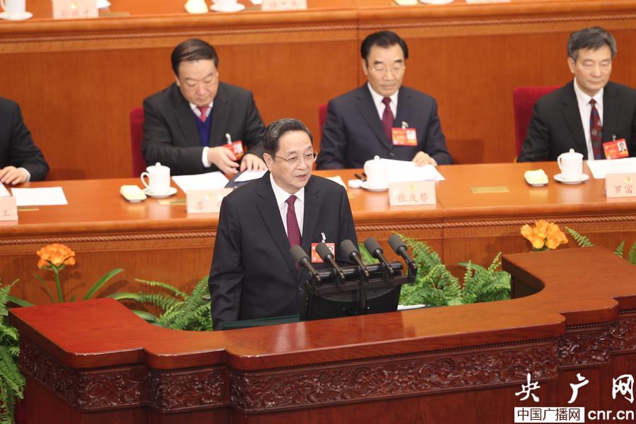 全國(guó)政協(xié)主席俞正聲代表政協(xié)第十二屆全國(guó)委員會(huì)常務(wù)委員會(huì)做工作報(bào)告(央廣網(wǎng)記者 杜虎 攝)