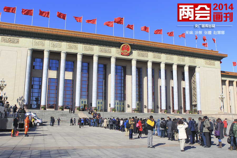 2014年3月4日,十二屆全國人大二次會議在人民大會堂舉行新聞發布會。圖為新聞發布會召開前記者排隊進場(央廣網記者 張曈 攝)