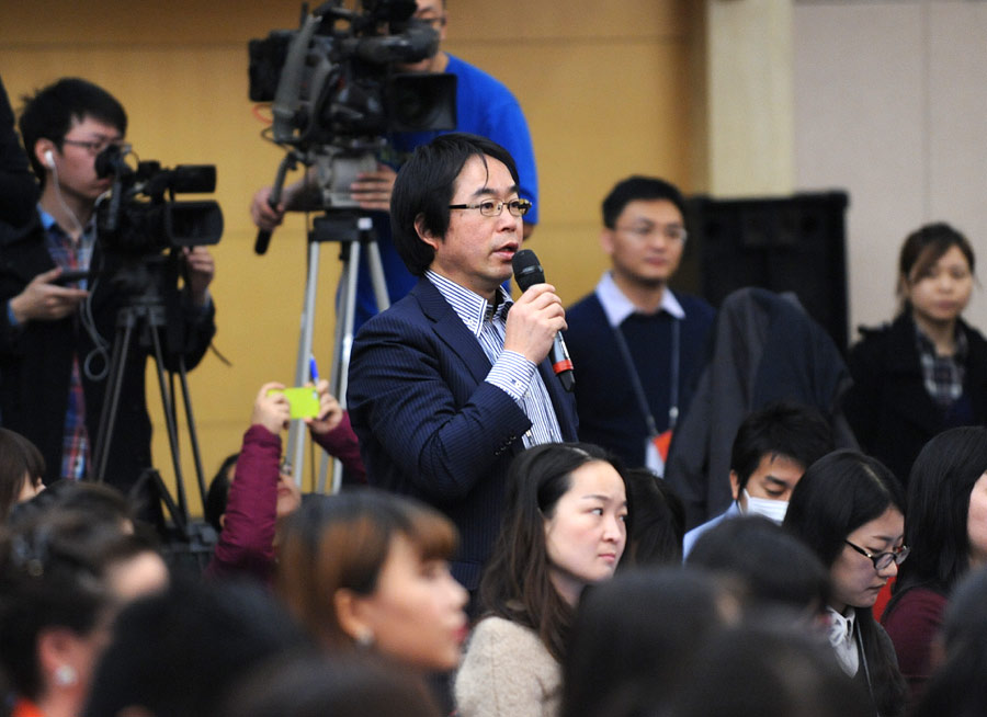 2014年3月6日上午9時,十二屆全國人大二次會議新聞中心在梅地亞中心多功能廳舉行記者會,邀請財政部部長樓繼偉、副部長張少春就“財稅體制改革和財政工作”的相關(guān)問題回答中外記者的提問。圖為亞洲通信社日本新聞網(wǎng)記者提問。新華網(wǎng)/中國政府網(wǎng) 翟子赫攝