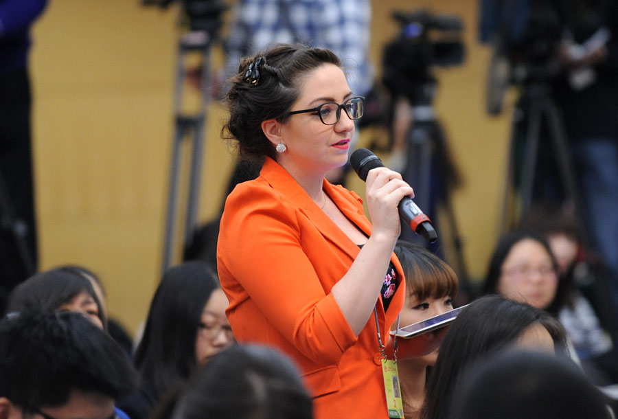 2014年3月6日上午9時(shí),十二屆全國人大二次會(huì)議新聞中心在梅地亞中心多功能廳舉行記者會(huì),邀請財(cái)政部部長樓繼偉、副部長張少春就“財(cái)稅體制改革和財(cái)政工作”的相關(guān)問題回答中外記者的提問。圖為澳大利亞環(huán)球凱歌傳媒集團(tuán)記者提問。新華網(wǎng)/中國政府網(wǎng) 翟子赫攝