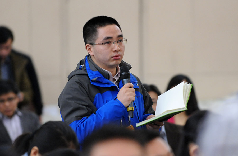 2014年3月6日上午9時,十二屆全國人大二次會議新聞中心在梅地亞中心多功能廳舉行記者會,邀請財政部部長樓繼偉、副部長張少春就“財稅體制改革和財政工作”的相關(guān)問題回答中外記者的提問。圖為中國互聯(lián)網(wǎng)新聞中心記者提問。新華網(wǎng)/中國政府網(wǎng) 翟子赫攝