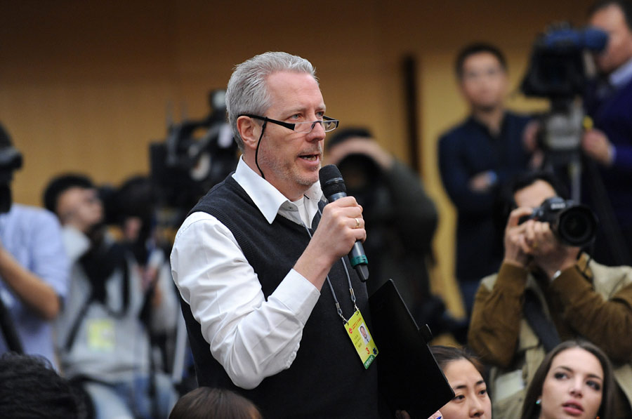 2014年3月6日上午9時,十二屆全國人大二次會議新聞中心在梅地亞中心多功能廳舉行記者會,邀請財政部部長樓繼偉、副部長張少春就“財稅體制改革和財政工作”的相關問題回答中外記者的提問。圖為德國新聞社記者提問。新華網/中國政府網 翟子赫攝