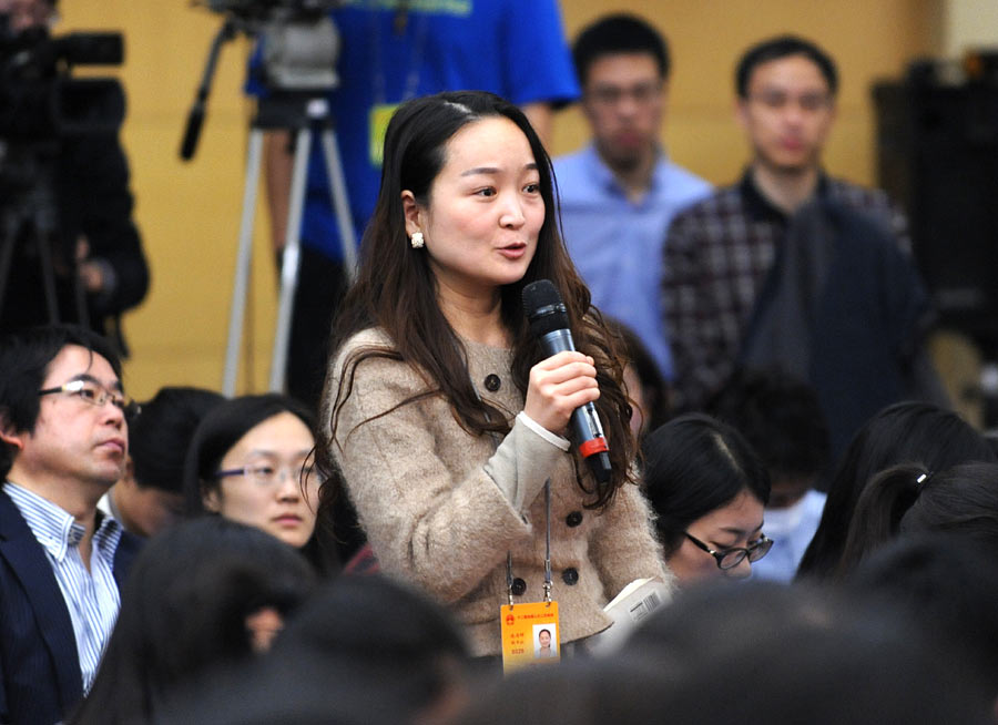 2014年3月6日上午9時,十二屆全國人大二次會議新聞中心在梅地亞中心多功能廳舉行記者會,邀請財政部部長樓繼偉、副部長張少春就“財稅體制改革和財政工作”的相關問題回答中外記者的提問。圖為新華社財經國家周刊記者提問。新華網/中國政府網 翟子赫攝