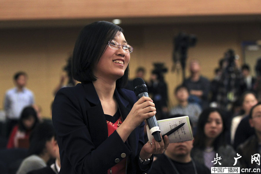 2014年3月5日下午,十二屆全國人大二次會議在梅地亞中心舉行記者會,國家發展和改革委員會主任徐紹史就“經濟社會發展與宏觀調控”的相關問題回答中外記者的提問。圖為中央人民廣播電臺、央廣網記提問(央廣網記者 張曈 攝)