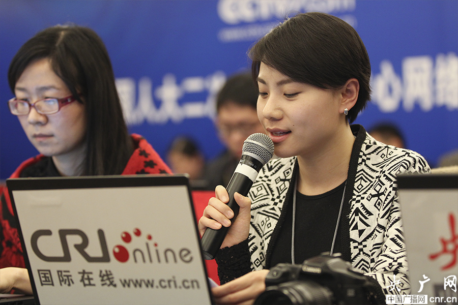 3月11日19時十二屆全國人大二次會議新聞中心舉辦主題為“強化法律監(jiān)督提升司法公信”的網(wǎng)絡(luò)訪談,圖為國際在線記者提出網(wǎng)友問題。 (央廣網(wǎng)記者 張曈 攝)
