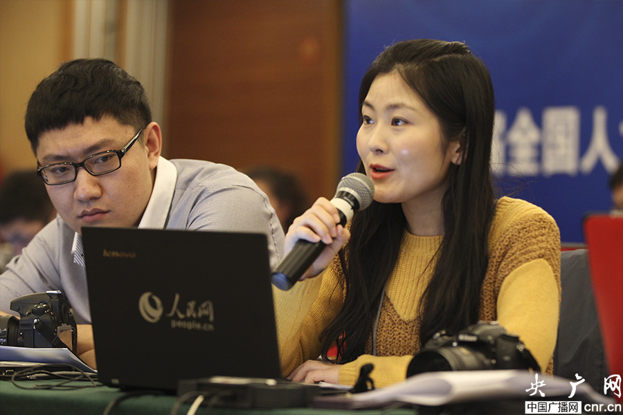 3月11日19時十二屆全國人大二次會議新聞中心舉辦主題為“強化法律監(jiān)督提升司法公信”的網(wǎng)絡(luò)訪談,圖為中國經(jīng)濟網(wǎng)記者提出網(wǎng)友問題。 (央廣網(wǎng)記者 張曈 攝)