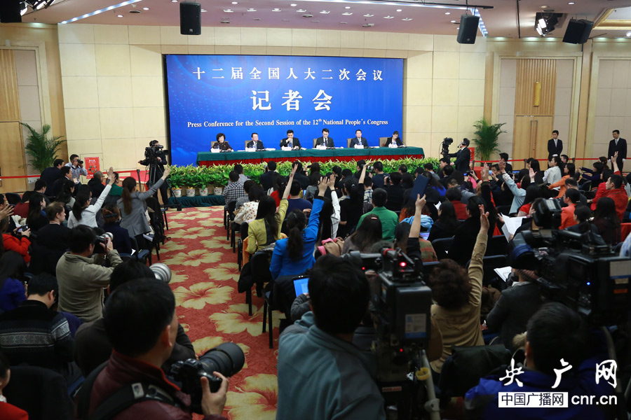 十二屆全國人大二次會議新聞中心于3月8日(星期六)15時(shí)在梅地亞中心多功能廳舉行記者會,邀請環(huán)境保護(hù)部副部長吳曉青、污染防治司司長趙英民、環(huán)境監(jiān)測司司長羅毅、污染物排放總量控制司司長劉炳江就“加強(qiáng)環(huán)境保護(hù)建設(shè)美麗中國”的相關(guān)問題回答中外記者的提問(央廣網(wǎng)記者涂傲)