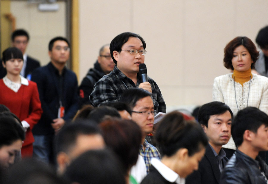 2014年3月6日上午10時30分,十二屆全國人大二次會議新聞中心在梅地亞中心多功能廳舉行記者會,邀請農業部部長韓長賦,總經濟師、新聞發言人畢美家就“扎實深化農村改革,加快發展現代農業”的相關問題回答中外記者的提問。圖為經濟日報和中國經濟網記者提問。新華網/中國政府網 翟子赫攝