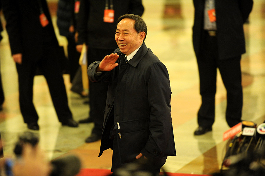 3月5日,第十二屆全國人民代表大會第二次會議在人民大會堂開幕,聽取國務院總理李克強作政府工作報告,審查計劃報告和預算報告。圖為教育部部長袁貴仁入場時向記者揮手。新華網/中國政府網 翟子赫 攝