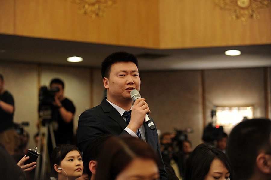 3月4日,十二屆全國人大二次會議新聞發布會在人民大會堂一層新聞發布廳召開,大會新聞發言人向中外媒體介紹本次大會有關情況,并回答記者提問。圖為中新社記者提問。新華網/中國政府網 陳競超 攝