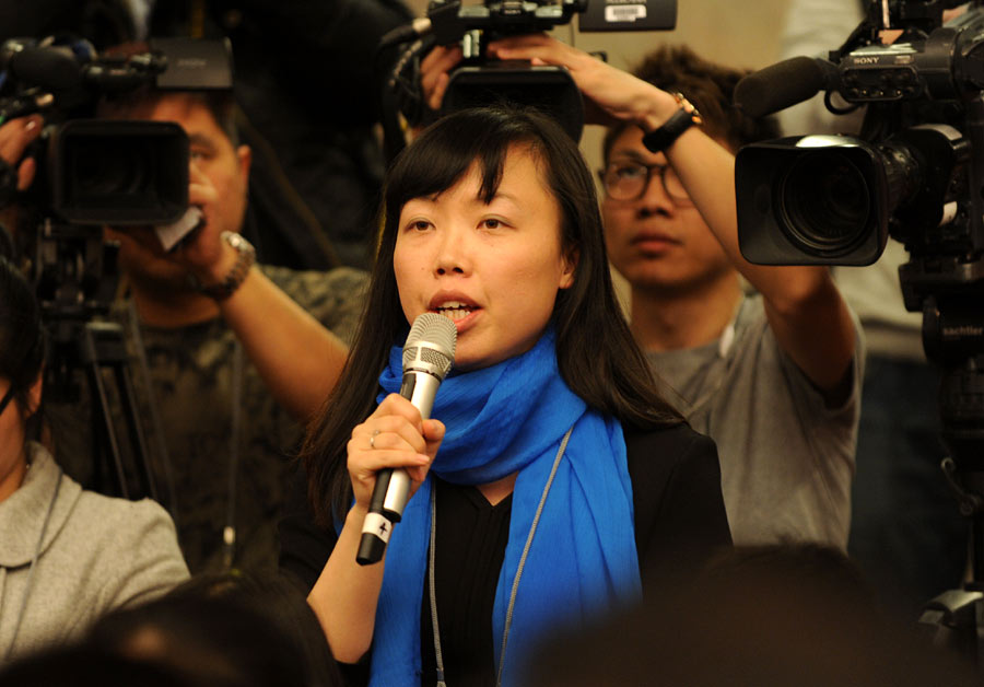 3月2日,全國政協十二屆二次會議新聞發布會在人民大會堂一層新聞發布廳舉行。圖為光明日報記者提問。新華網/中國政府網 翟子赫 攝