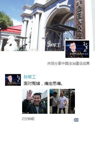 孫軍工發微信朋友圈:面對冤錯 痛定思痛