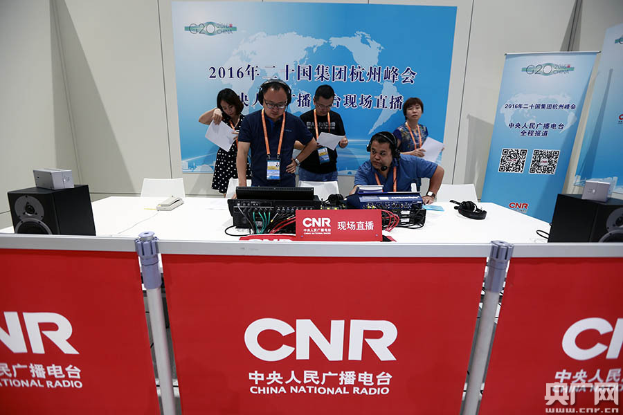 中央人民廣播電臺G20杭州峰會前方報道組在為現場直播做準備工作。(央廣網記者 黃一博/攝)