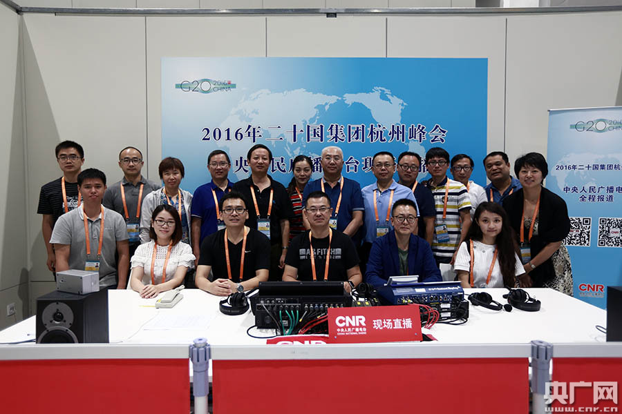目前,中央人民廣播電臺前方報道組人員已全部抵達杭州,開始了緊鑼密鼓的報道。前方報道組由臺總編室、新聞節目中心、財經節目中心、對臺灣節目中心、對港澳節目中心、民族節目中心、軍事節目中心、播出傳送中心、央廣網、浙江記者站等部門50余人組成,在G20杭州峰會新聞中心租用了50平米專用工作間,不間斷地為全國受眾帶來報道。