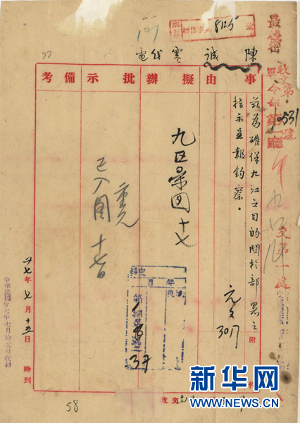 1938年7月14日,第九戰區司令長官陳誠報告防守九江之部隊部署情形致蔣介石代電。 新華社發(第二歷史檔案館提供)