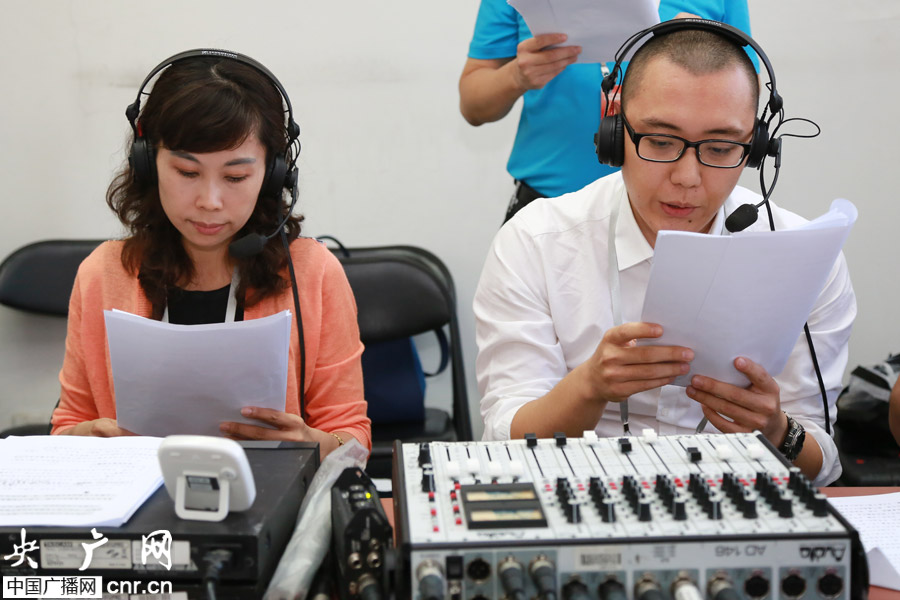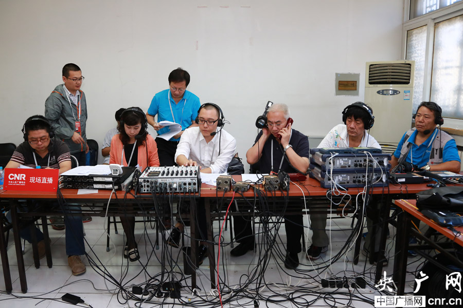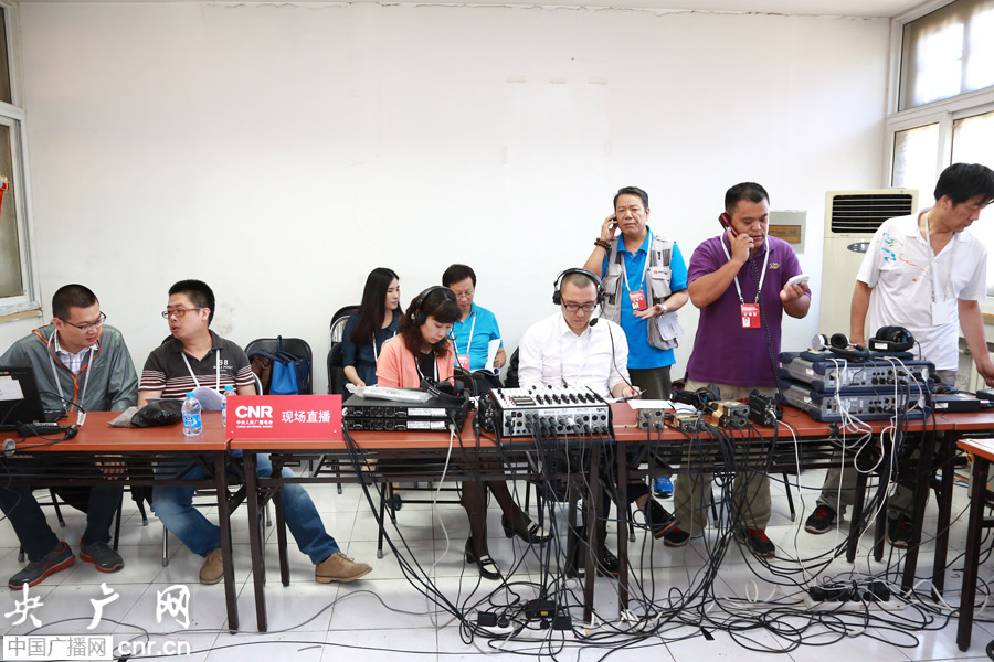 9月3日上午,中共中央、國務院、中央軍委在北京舉行向抗戰烈士敬獻花籃儀式,中央人民廣播電臺中國之聲、央廣網進行現場直播,圖為直播開始前的準備工作。