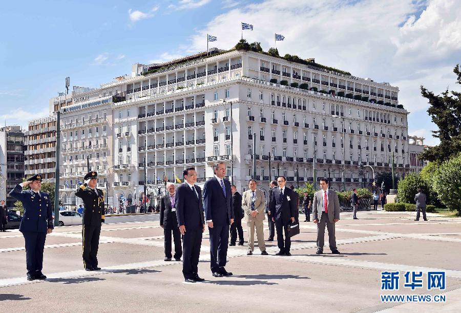 6月19日,中國國務院總理李克強在希臘總理薩馬拉斯的陪同下,向希臘無名戰士紀念碑獻花圈。 新華社記者 李濤 攝