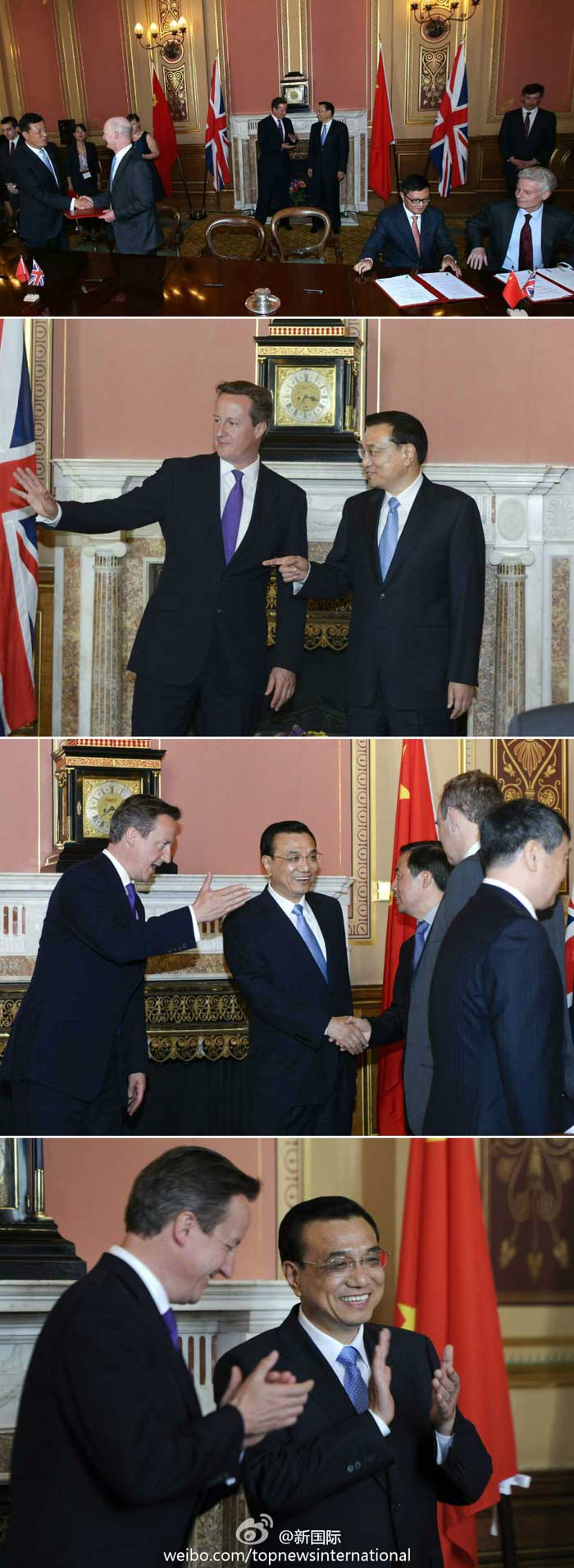 新華網北京6月18日電 據新華社“新國際”微博報道,當地時間17日下午,國務院總理李克強與英國首相卡梅倫舉行會談后,共同見證了有關雙邊合作文件的簽署。中英雙方共簽署數十項政府和商業間協議,取得多方面合作突破。內容涉及金融、科技、教育、能源、基礎設施建設等多個領域,總額超過300億美元。
